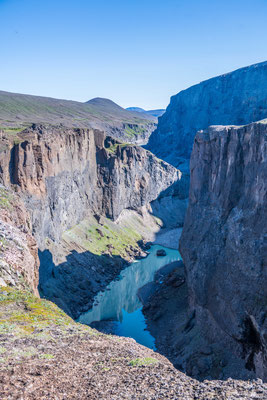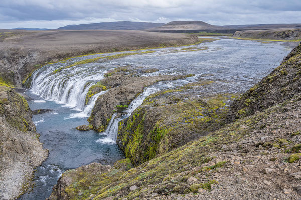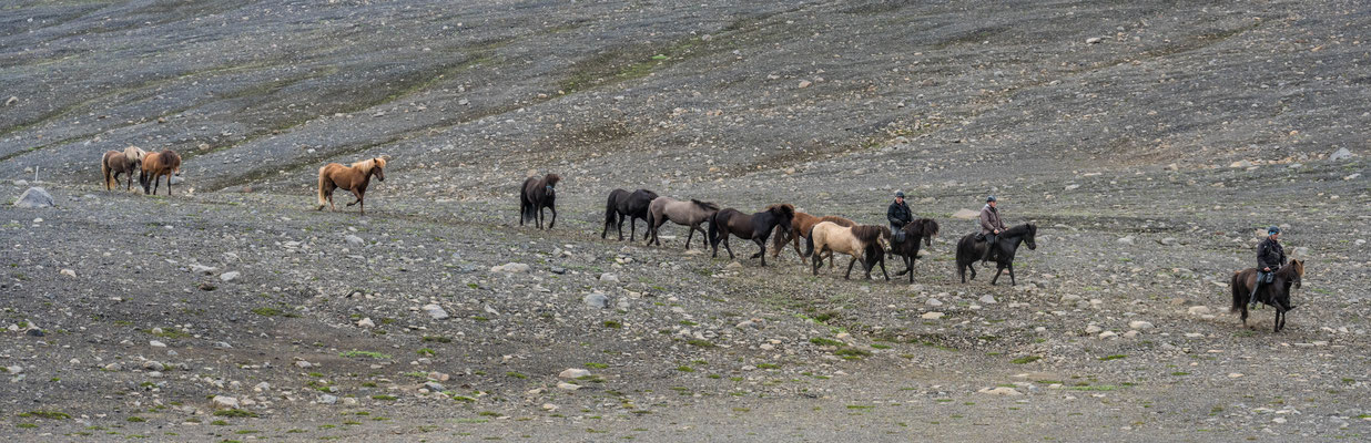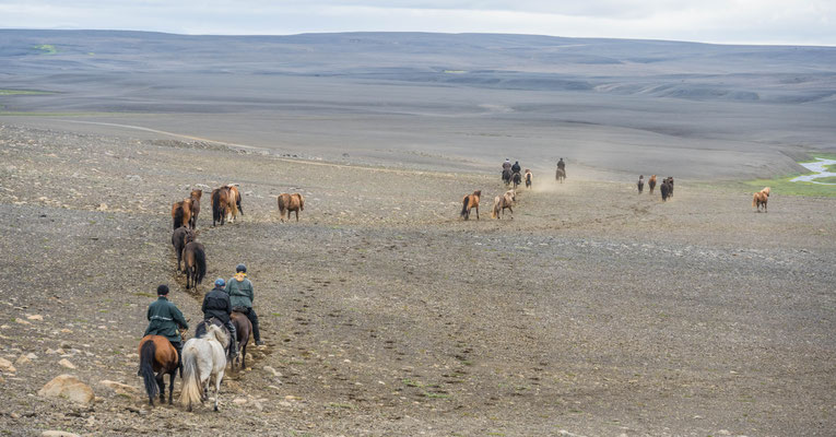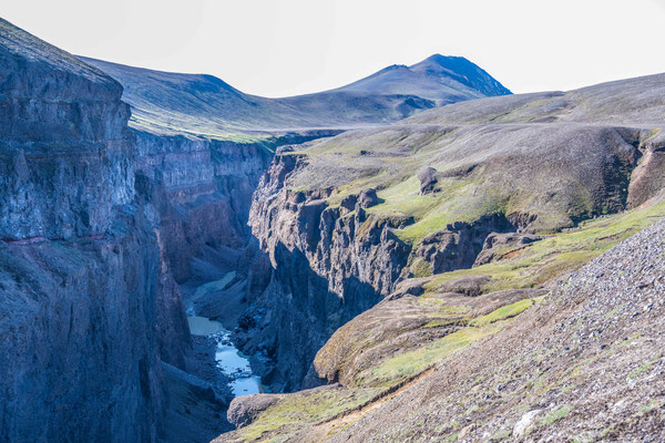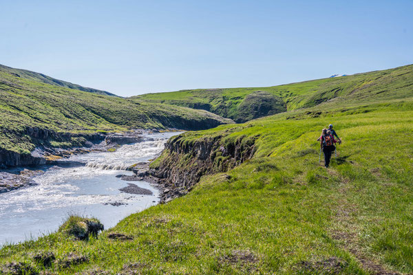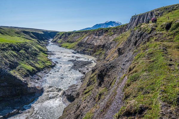 Als wir an den Klippen über dem Fluss Jökulsa a Fjöllum ankamen, genossen wir eine Mittagsrast mit bester Aussicht hinunter auf das tosende Wasser. Der Rückweg führte uns durch niedrigen Birkenwald, vorbei an saftigen Wiesen hinunter in die Ebene, bevor wir unser Camp wieder erreichten.