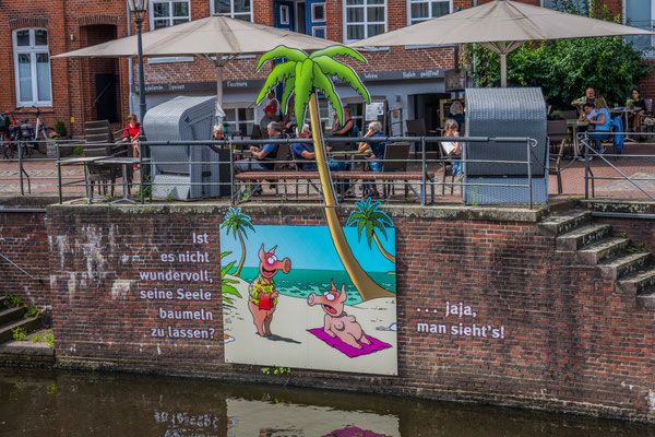 Ein Spaziergang durch den Ortskern offenbarte auch viele witzige Details, wie zum Beispiel die Cartoons an den Hafenwänden, welche lustige Szenen darstellten.