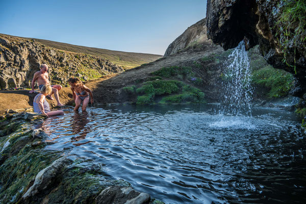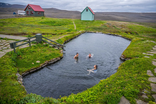 Am Eingang des Reykiafjördur trafen wir mitten in der Landschaft auf ein Schwimmbad mit Thermalwasser. Zwei Bassins mit unterschiedlichen Temperaturen und ein natürlicher Hot Pot luden zu einem kostenlosen, entspannenden Bad ein.