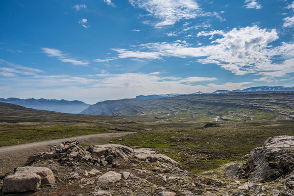 Vom Fährhafen aus führte die Strasse steil hoch zu einem Pass. Auf der Hochebene, nur gerade 400 müM, empfingen uns meterhohe Schneefelder und eisbedeckte Seen! In Egilsstadir legten wir einen Zwischenhalt ein, um frische Lebensmittel einzukaufen. Da die Luzerner noch weitere Besorgungen erledigen mussten, fuhren wir voraus, um uns später auf dem Campingplatz in Borgarfjödur wieder zu treffen.