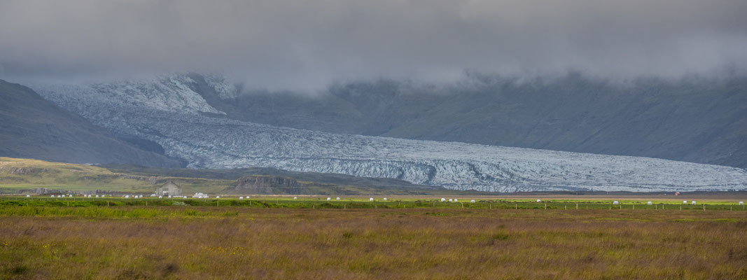 Die südliche Route entlang der Küste zeigte sich uns nicht ganz so spektakulär wie die nördliche, was jedoch auch damit zusammenhängen konnte, dass das Wetter neblig war und fast durchwegs leichter Nieselregen fiel. Sobald die Strasse auch noch anstieg, landeten wir unweigerlich in den Wolken und die Sicht war gleich null. In Budardalur hatten wir mit Rita und Ueli einen Treffpunkt vereinbart. Da zuvor ein Stück der Strasse nicht asphaltiert und nass gewesen war, war das Auto entsprechend mit Schlamm vollgespritzt. Wir nutzten die Wartezeit, um an der üblichen Gratisautowaschanlage bei der Tankstelle den gröbsten Dreck herunter zu waschen. Wir fuhren bei nun wieder recht freundlichem Wetter in ein herrliches Tal hinein, in welchem das Haus des berühmten Wikingers, der Rote Erik, nachgebaut worden ist. Wer mag, kann sich dort von verkleideten Isländern die Sagen und Geschichten der ersten Siedler vortragen lassen.