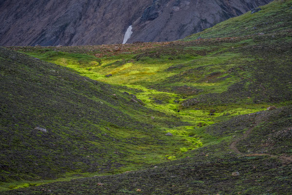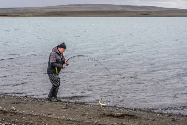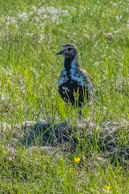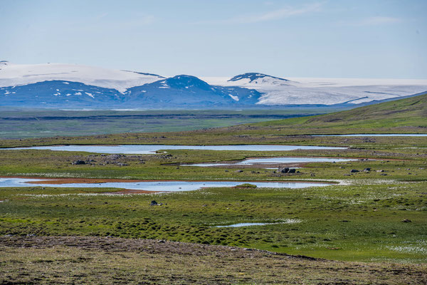 Strahlender Sonnenschein und angenehme Temperaturen liessen uns auch am folgenden Morgen draussen im T-Shirt frühstücken. Anschliessend unternahmen wir eine weitere, diesmal bedeutend längere Wanderung über die Westseite des Tales. Auch hier überraschte uns die vielseitige Landschaft. Nachdem wir oberhalb des Sees am Ende des Talkessels angelangt waren, führte der Pfad nach Osten weiter. Mitten auf der Hochebene tauchten kleine, dunkelsandige Dünen auf. Die Formenvielfalt dieser Sandlandschaft war überwältigend. Verschiedene Vögel begleiteten uns auf dem weiteren Weg. Vor allem ein Goldregenpfeifer und ein Regenbrachvogel blieben längere Zeit in unserer Nähe und unterhielten uns mit ihrem Gesang.