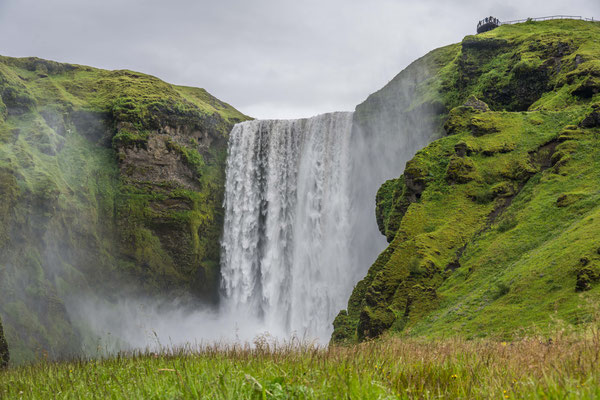 Am Gullfoss trafen wir wieder mit unseren Luzerner Freunden zusammen. Der eindrückliche Wasserfall war mächtig und führte ein grosses Volumen an milchig-grauem Wasser. Die Fluten stürzen über mehrere Stufen in eine 70 m tiefe Schlucht, deren Grund durch die aufstiebende Gischt kaum wahrzunehmen ist. Dieser Wasserfall, einer der bekanntesten in Island, ist problemlos mit einem Tagesausflug von Reykjavik aus erreichbar und hatte deshalb wesentlich mehr Touristen als die bisher besuchten Sehenswürdigkeiten.