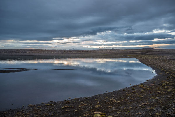 Zurück an der Ringstrasse liegt ein weiteres geothermisches Areal, der Namafjall. Neben ausgedehnten, vielfarbigen Schwefelablagerungen trifft man hier vor allem auf unzählige Schlammtöpfe. Je nach Viskosität des Schlammes blubbern sie nervös und hektisch oder aber sie bilden zähflüssige Blasen, die in klebrigen Eruptionen platzen. Seit wir in Island angekommen waren, war dies übrigens die erste Gegend, wo etwas mehr Besucher anzutreffen waren. Nicht dass die Orte überlaufen gewesen wären, aber nach den zuvor besuchten Regionen, wo kaum Touristen unterwegs waren, ist es uns doch aufgefallen.