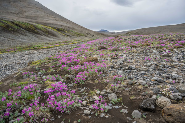 Der Wind hatte in der Nacht gedreht und uns von hinten die kalte Luft ins Auto gedrückt. Dadurch war es sowohl im Inneren des Autos wie auch draussen nur gerade 13°C "warm" beim Aufstehen. Obwohl die Sonne schon bald durchdrückte, blieb vorerst unangenehm kalt und windig. Nach ein paar Kilometern Piste erreichten wir die Teerstrasse kurz vor Raufarhöfn. Etwas ausserhalb des Ortes hat ein kreativer Bauer vor ein paar Jahren angefangen, aus mächtigen Steinblöcken eine Art Stonehenge Kreis aufzubauen. Wohl in Anlehnung an das historische Monument in England wurde dieser moderne Steinkreis Arctic Henge benannt. Die eindrückliche Einrichtung steht gut sichtbar auf einem Hügel, an dessen Fuss ein grosses Feld mit Lupinen in blauer Pracht leuchtete.