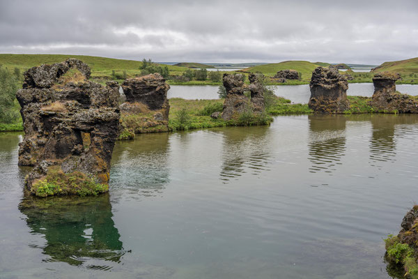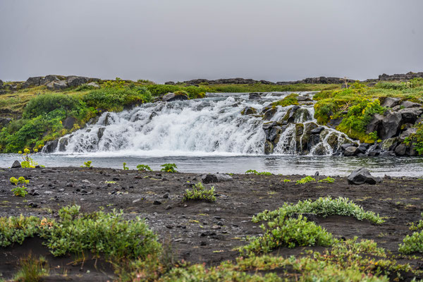 Der Morgen verlief bedeckt und es schien, als ob wir das erste Mal mit Regen rechnen mussten. Wir legten entlang des Sees mehrere Zwischenhalte ein und bewunderten die vielfältige Vogelwelt und die von den Vulkanen geschaffene Landschaft. Während der Weiterfahrt begann es tatsächlich zu regnen. So gestaltete sich der Besuch beim Godafoss eher trübe und feucht, aber trotz allem boten die rauschenden Wassermassen ein eindrückliches Bild.