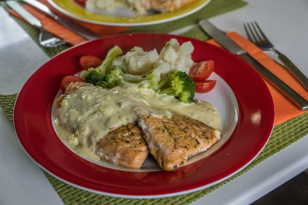 Im Reiseführer hatten wir gelesen, dass in Talknafjördur ein Selbstbedingungsstand mit frischem Fisch existiert. Nach kurzem Suchen fanden wir den einfachen "Laden" und erstanden herrliche Lachsforellenfilets für ein feines Sonntagsnachtessen.