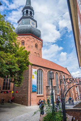 Bis zur Elbfähre nach Glückstadt fehlten nur noch wenige Kilometer. Diese Überfahrt ist, fast 60 km stromabwärts von Hamburg aus, die erste Möglichkeit, die Elbe zu queren. Infolge des recht grossen Andranges verpassten wir die erste Fähre und mussten einige Minuten auf die nächste Gelegenheit warten. Immer öfter entdeckten wir nun die gemütlich aussehenden, schilfgedeckten Häuser entlang der Strasse, die so typisch für Norddeutschland sind. Die Landschaft blieb flach wie ein Brett, nur ab und zu erhob sich ein Deich aus der Ebene, der aufzeigte, wie die Menschen dem Meer Land abtrotzen konnten. Wir hatten beabsichtigt, in Husum zu übernachten, in der Hoffnung, am Abend das EM-Fussballspiel Schweiz-Spanien in einer Bar verfolgen zu können. COVID bedingt waren jedoch die Sanitäranlagen des Stellplatzes geschlossen und wir wollten gerne eine Dusche nehmen. Wir beschlossen daher weiterzufahren und fanden einige Kilometer weiter einen schönen Platz hinter dem Deich bei den Hamburger Halligen. Das Camp war gut besucht, denn am Abend fand vor Ort ein Mini Triathlon statt, welcher die Athleten bei uns vorbei führte. Die Teilnehmer kamen per Fahrrad vom 10 km entfernten Ort an, hatten über den Deich zur Hamburger Hallig hinaus zu laufen und dort eine kurze Schwimmstrecke im Meer zu absolvieren. Von dort ging das Ganze wieder zurück zum Start.