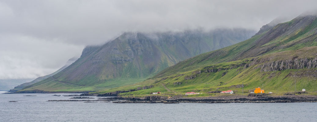 Als erstes fuhren wir nach Bolungarvik hinaus, wo die Fischereistation Osvör, welche ursprünglich um 1905 herum erbaut worden war, originalgetreu wieder errichtet wurde. Da das kleine Freilichtmuseum am frühen Morgen noch geschlossen war, beschränkten wir uns darauf, die Gebäude von aussen zu besichtigen und einen Blick durch die Fenster ins Innere zu werfen. Jedenfalls erhielten wir anhand der Einrichtungen einen guten Eindruck, unter welch einfachen Bedingungen die Fischer damals ihren Lebensunterhalt verdienen mussten. Die Strasse zurück nach Isafjördur führte bereits durch einen ersten Tunnel und kaum hatten wir das Tageslicht wieder erblickt, verschwand sie wieder in einer kilometerlangen Röhre. Speziell an diesem Tunnel war, dass er mittendrin eine Verzweigung aufwies und anschliessend nur noch einspurig geführt wurde. Auf die Benützung des neu gebauten Tunnels vom Dyrafjördur zum Arnarfjördur verzichteten wir und wählten stattdessen die alte Piste durch die Berge. War es am Morgen noch strahlend sonnig gewesen, tauchten wir nun auf dem Pass in die tief hängenden Wolken ein. Trotz allem war die Fahrt sehr abwechslungsreich und wir wurden immer wieder mit eindrücklichen Ausblicken belohnt.
